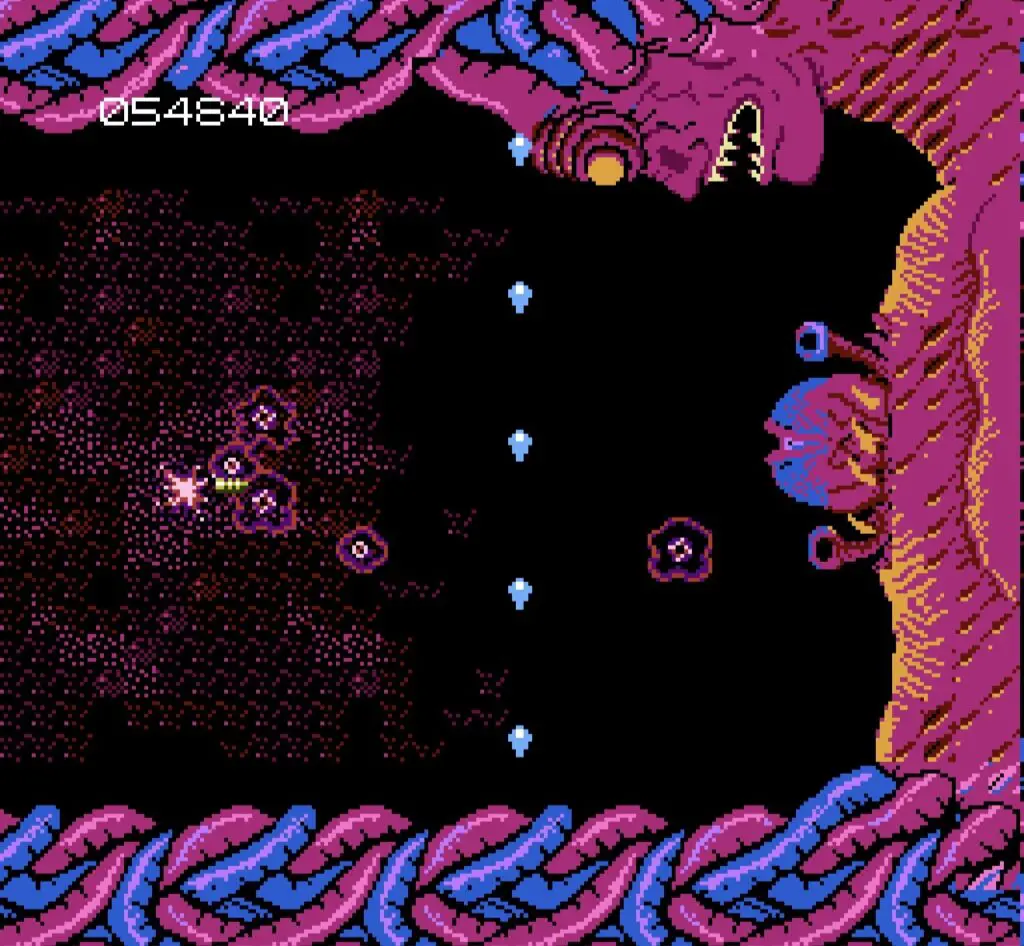 The game has an interesting back story. Amazingly, it’s not even the first NES game that plays the whole Fantastic Voyage routine for horrific effect. A few years earlier, publishing titan Konami beat Abadox to the punch with arcade favorite Life Force (which, despite the name, has nothing to do with that one movie directed by Tobe Hooper.) Both games have more or less the exact same premise — you control a space ship flying through the “body” of a planet-sized demon — but Abadox took the concept to truly stomach-churning heights. Or lows, depending on your perspective.